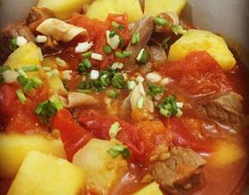 接着将土豆块倒入牛肉锅中,慢炖十分钟