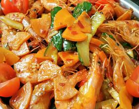 5、锅里剩少许油爆香花椒、葱丝、姜丝、蒜粒 放入胡萝卜条和黄瓜条翻炒两三分钟加入一点十三香、半勺白糖和一勺豆瓣酱翻炒片刻加入小半碗水,放入炸好的虾和土豆条炒匀收汁放点鸡精和香油就可以出锅了。