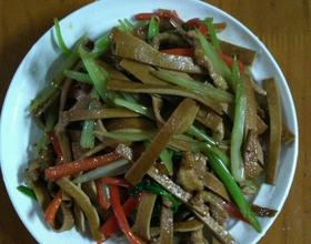 芹菜,红椒,豆腐干,肉切丝,肉腌制一下