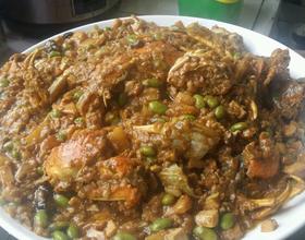 1,将螃蟹洗净剁开,加生粉鸡蛋过油。虾去头尾同上。
