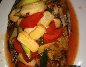 - 5. 锅留低油,倒入调好的酱汁跟切好的料块煮开,勾少许薄芡,浇倒炸好的鱼上面就可以了