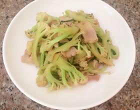 煸炒菜花的时候要中火不停地翻炒,如果用全瘦肉的话要先加入调料淀粉等上一下浆,这样炒出来的肉嫩滑。
