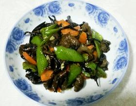 尖椒炒起皮后放入蘑菇,翻炒几下放生抽