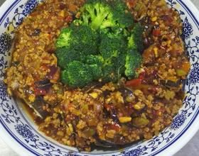 锅留余油将五花肉炒香,蒜、洋葱、尖椒炒出味下豆瓣酱、蒜蓉辣椒炒香,加入水少许再放入调味品勾芡淋在茄子上即可