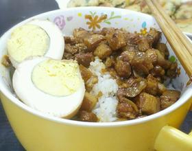- 15. 猪肉差不多煮好 放入鸡蛋 和之前的油葱酥再煮个几分钟就可以了