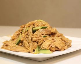 - 1. 将泡好的腐竹斜刀切成菱形段,放入盘中备用。