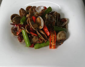 将文蛤倒入开水中稍煮,而后捞出,去掉文蛤里面的内脏和沙子再用清水冲洗干净备用,芹菜切条,青红辣椒切马耳朵。干辣椒切节。姜蒜切末备用