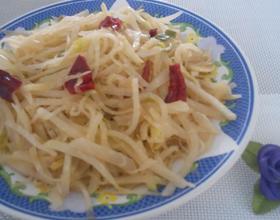 倒入香醋,把苤蓝丝炒蔫。苤蓝水分少,倒入一点点热水,闷炒一分钟