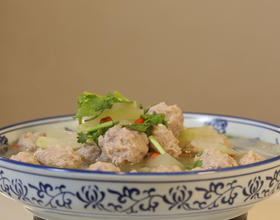 - 7. 出锅,撒香菜10克,一道美味可口,色香味俱全的冬瓜汆丸子就这样展现在大家面前了。