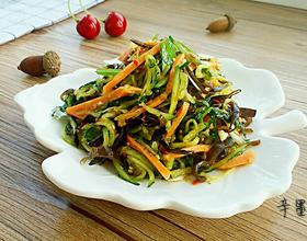 把木耳,黄瓜,火腿和胡萝卜放到盆中。