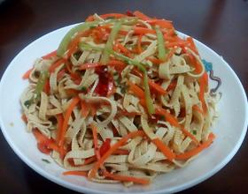 - 5. 烧开水下千张丝,胡萝卜丝,芹菜丝焯一水迅速捞起来控干水,装的一个大点碗里,