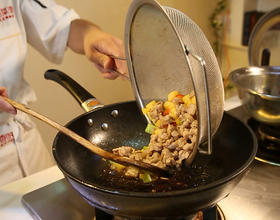 - 6. 然后用锅中的热油把土豆焯熟,放入红椒丁、尖椒丁,氽一下,倒入放鸭丁的漏勺备用。