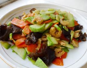 西葫片、木耳,大火翻炒,倒少许生抽(也可不放)、盐、鸡精,五分钟后起锅装盘。