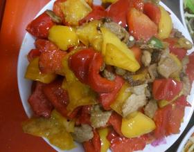 红黄彩椒掰成小块,猪肉切片,葱姜切丝
