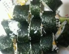 摊上米饭,加上黄瓜,鸡蛋,火腿肠,胡萝卜(都是切好的)
