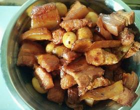 放入五花肉炒至偏黄色、放上料酒~盐~十三香.