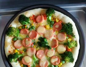 表面涂上辣椒酱,然后放芝士,接着放什锦菜,用烤肠和西兰花装饰,上面再放一些芝士