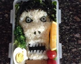 头顶和嘴巴放海苔丝,再按上眼睛鼻孔和牙齿,鬼脸的造型就完成了。