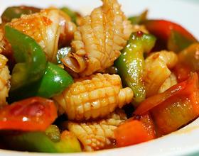 加入鱿鱼翻炒片刻,调入料酒、生抽、糖。