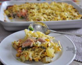 最后土豆泥上撒上奶酪。撒满也好,不撒满也好,自己喜欢就好。放入预热好的烤箱,200度,20分钟。即可。