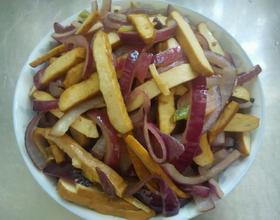 把洋葱和豆干翻炒均匀,快熟时放一点盐。