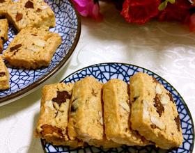 - 4. 再分别放入燕麦片、面粉、玉米淀粉、红枣核桃颗粒,搅拌均匀。揉成面团。