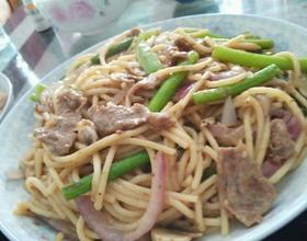 - 6. 加入菜,爆炒!差不多的时候,加入意大利面!加少许清水,盐,黑胡椒醬。就准备装盘了