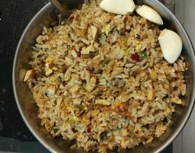 开火!放油!炒鸡蛋!注意!当鸡蛋刚刚成型时,立刻放入剩米饭!充分翻炒!使其蛋液和米饭结合!