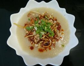 大概10分钟左右米熟了成了米糊状,放盐,生抽,香油搅拌均匀。