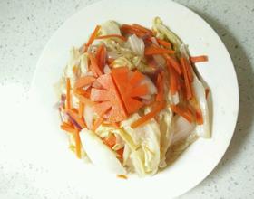 锅里放油,待烧热后放入胡萝卜,炒出胡萝卜的营养,再放洋葱,炒至五分熟,放入大白菜。