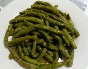 7成油热下豆角炸,直到表面出现褶皱成碧绿色。