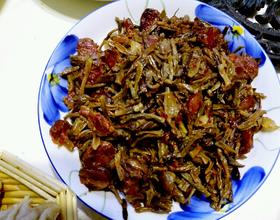 干豆角洗洗,凉白开泡半天,完全泡开。入热水煮两分钟。