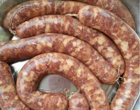 4.把淹好的肉通过漏斗灌到肠衣中,「4~5寸的样子。」