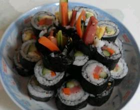 卷紧后用刀切块摆碟,吃时用寿司醋着吃蘸