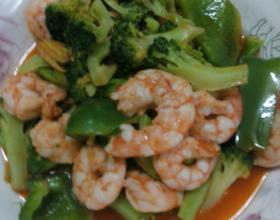 热锅后放入姜丝煸香,再加入虾仁翻炒,虾仁变色之后加入甜椒、西兰花,、盐巴、味精、少许料酒
