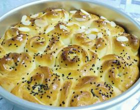 表面刷蛋液,撒杏仁片或芝麻。放进烤箱25分钟左右。
