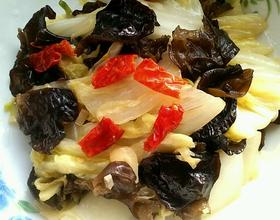 菜品全部选择片状,葱姜蒜切片,白菜切片,木耳手撕片,红辣椒备好