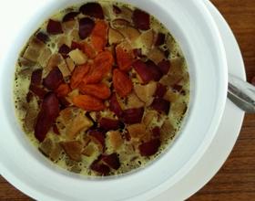 往打好的鸡蛋里加入甜酒拌匀,最后加入红枣丁和杞子入锅蒸10分钟