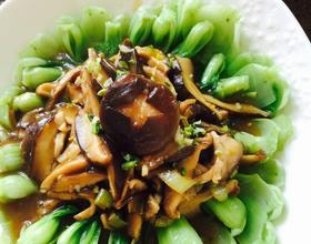 - 5. 香菇片入锅,翻炒片刻,加入少许盐糖、生抽,加入少许水,稍煮片刻,加入耗油,勾入少许水淀粉,开锅关火淋入香油,即可出锅
