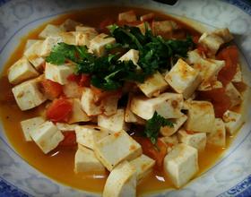翻炒约30秒,加豆腐块,继续翻炒,约一分钟后,就加入热水,没过豆腐番茄