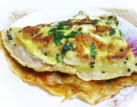- 10. 打一个鸡蛋在上面,用刷子刷匀,撒上葱花、香菜、黑芝麻(家里做先把鸡蛋打散再倒在饼上)