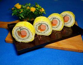 方子份量約可以做4條蛋皮包飯團,請按自家人口所需的食量調整方子吧,卷的飯團要卷得結實些以免鬆散,蛋皮要慢慢火的煎,不要煎得太老影響口感,饀料種類可按個人口味自行選擇