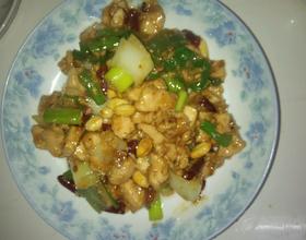 继续中火,烧至六成热将腌好的鸡丁放入,迅速滑炒至散,待鸡肉成熟色,再捞出沥油分。
