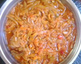 锅中放油,油热后,把切好的茄子放进去,炒一炒。