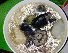 乌鸡焯水洗净放锅里加水煮45分钟葱姜放入,料酒,,因为怕腥放了两粒大料