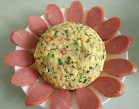 - 7. 锅中再倒入少许油,把晾好的小米倒入锅中,翻炒至小米都散开,倒入切碎的韭菜,胡萝卜,鸡蛋。翻炒均匀后即关火,用余温再翻炒几下,最后调去少许盐调味