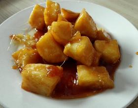 然后油锅里放油,白糖炒,炒成糖浆再加炸好的苹果就行了。