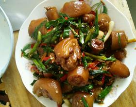 在放鲜红辣椒和蒜苗一起翻炒大约五分钟就可以装盘子
