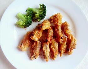 将挂满粉糊的虾头逐个放入油热的锅内炸