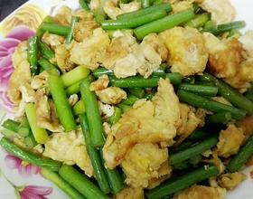 锅中放油,放入蒜苔翻炒数下,放进炒好的鸡蛋,倒入适量的料酒、酱油,盐、炒菜香,翻炒均匀后出锅。